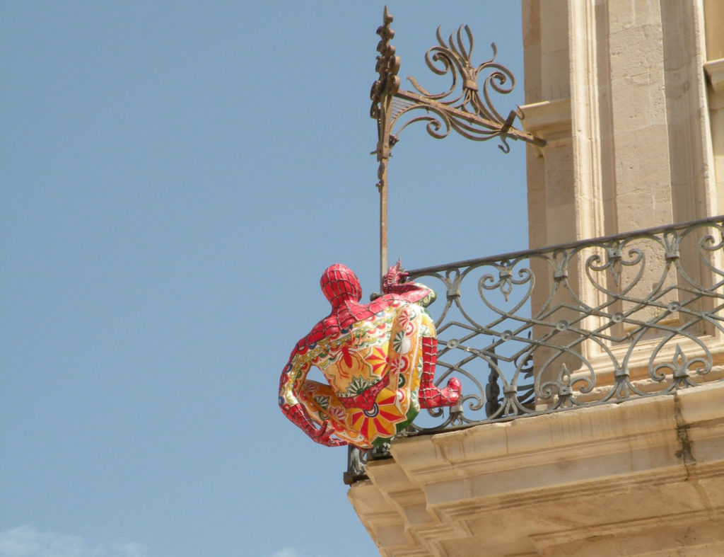 この日は朝からオルティージャ島へ向かい、さっそくカメラを手に旧市街へ。ドゥオーモやその他周りの建物は改装されたのか、以前と比べると壁が真新しくなっていて、真夏の強い日差しにまぶしいほどだった。市庁舎が入っている建物にはなぜかスパイダーマンのオブジェが…、珍しかったのでこれもカメラに収めた(トップ画像)。